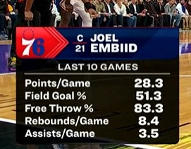 过去10场比赛:恩比德场均28.3分8.4板3.5助 投篮51.3%&罚球83.3%