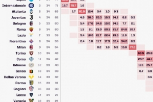 根据Opta超级计算机的预测,那不勒斯有81.3%概率赢得本赛季意甲冠军,国米夺冠概率为18.7%。