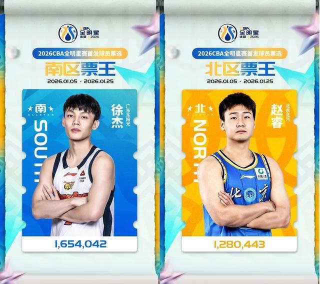 今天下午,CBA联赛官方正式公布2026年CBA全明星赛首发球员票选结果。广东队后卫徐杰以1,654,042票当选南区票王及总票王,北京队后卫赵睿则以1,280,443票荣膺北区票王。