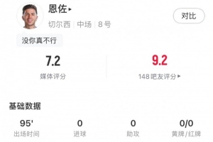 体育资讯7月5日讯 世俱杯1/4决赛,切尔西2-1击败帕尔梅拉斯,晋级赛事四强。恩佐首发踢满全场,最终获得7.2分的赛后评分。