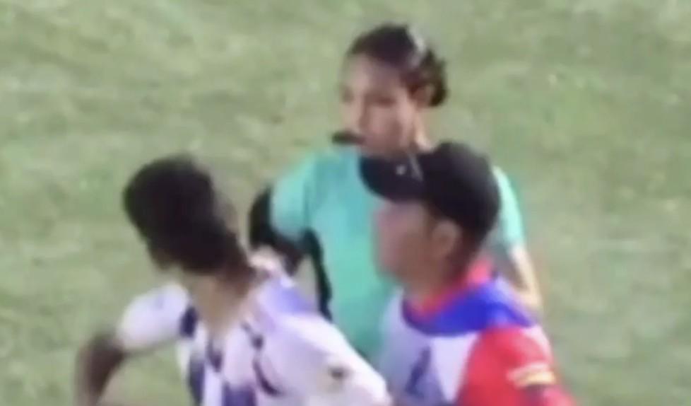 哥伦比亚一场比赛中,女裁判瓦内萨-塞瓦略斯在执法过程中遭到了球员掌掴。