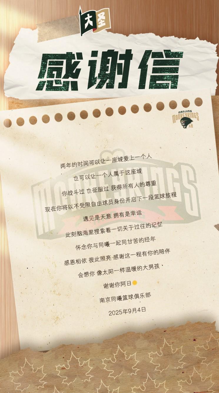 同曦男篮在社媒中写道:“是一起哭过笑过的人,是在同一个团队一起拼过命的人,是一起创造球队历史的人。谢谢你阿日,未来一切顺利。”