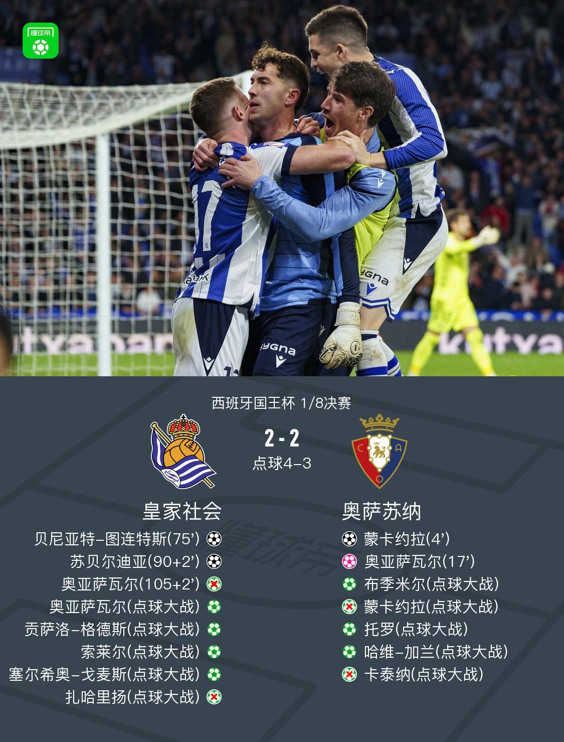 北京时间1月14日西班牙国王杯 1/8决赛,皇家社会对阵奥萨苏纳。皇家社会贝尼亚特-图连特斯破门,苏贝尔迪亚破门,奥亚萨瓦尔自摆乌龙。奥萨苏纳蒙卡约拉破门。最终比分皇家社会 6-5 奥萨苏纳。