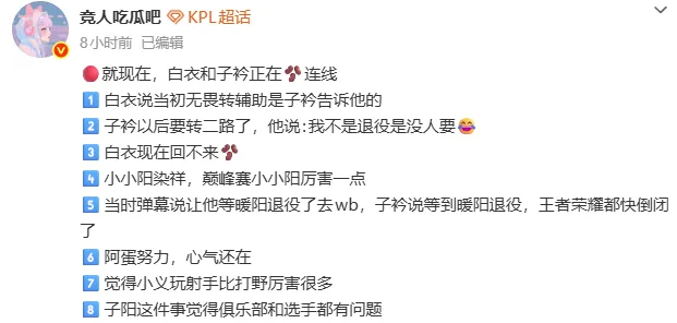 白衣和子衿连线,说等到暖阳退役,王者荣耀都快倒闭了,阿蛋心气还在